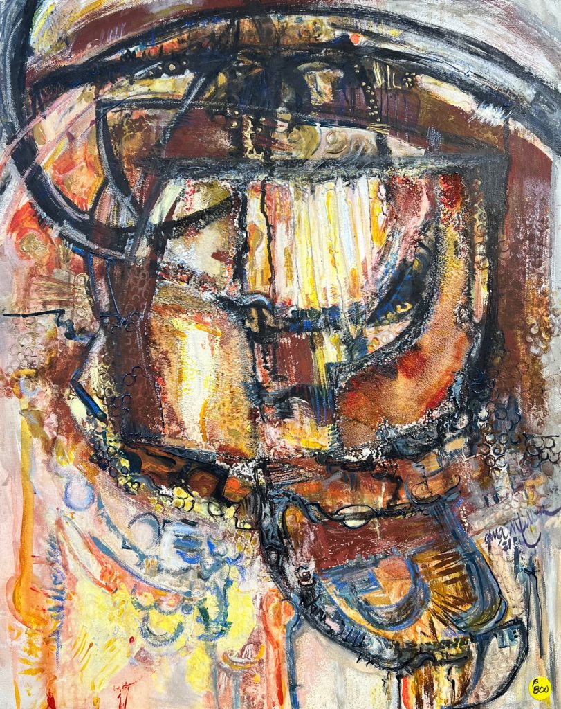The ongoing dialogue with the painting begins once I start to overlay the various mixed media, then the composition unfolds. I like using bold contrasting colours and I experiment with textures hoping to pull the viewer into the emotion of the painting thru movement, rhythm and colour. The painting is finished when it radiates energy and intensity. My paintings are of my inner psyche and come to me like dreams.